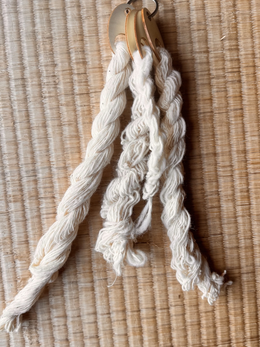 (左から:ガラ紡の双糸、ガラ紡の再撚り、カベ糸、ガラ紡の再撚り&双糸)
