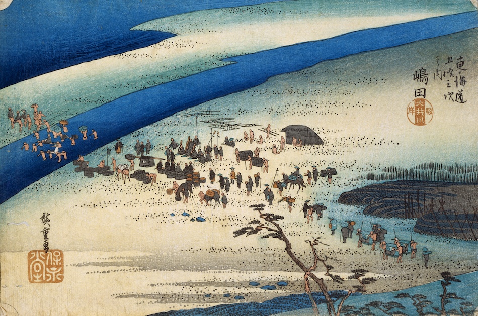 東海道五十三次之内「嶋田 大井川駿岸」 歌川広重 天保4–5年(1833–34) 木版多色刷(横大判錦絵) 東京富士美術館所蔵より引用